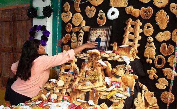 Cuando se colocan las ofrendas en el Día de los Fieles Difuntos, se cubre la mesa de flores, mientras los familiares y amigos del fallecido rezan hasta la medianoche, hora en que los alrededores del altar quedan vacíos hasta las primeras luces del alba, para no espantar la visita de su alma.
