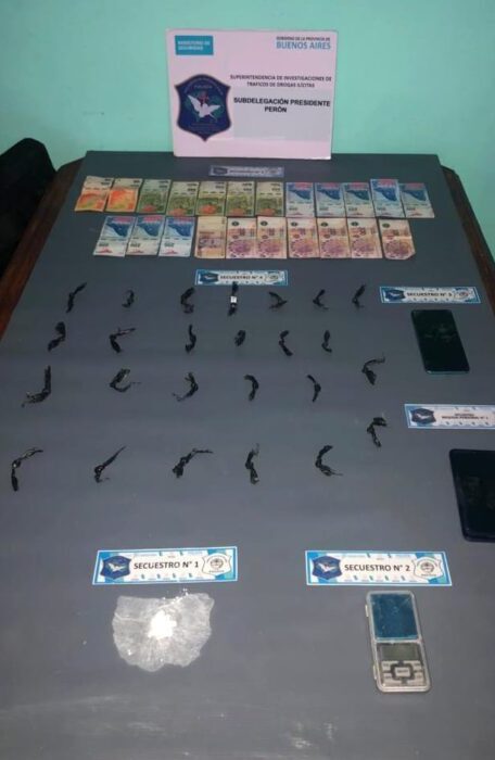 Se procedió a la detención de dos adultos, un hombre y una mujer que serían de apellido Endara. Se secuestró asimismo un bulto de clorhidrato de cocaína, 25 bolsitas de fraccionada en dosis de la misma sustancia listas para ser comercializadas, $7.000 en efectivo, teléfonos celulares, una balanza de precisión, un Chervolet Corsa gris que era utilizado para entregar la mercadería ilícita a domicilio del negocio y demás elementos de la actividad ilícita.