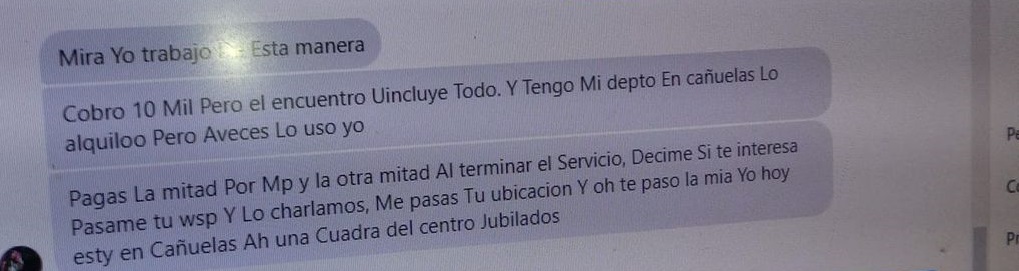 El Caso de Gustavo: Comenzada la charla por privado con la persona que consumará la estafa «la supuesta vendedora de placer» le ofrece un encuentro íntimo. Para eso le pidió dinero por adelantado que efectivizó por transferencia a un CBU. una vez realizado la transferencia la charla siguió por whatsApp. «Ella» le indica, antes de confirmar el lugar del encuentro que quiere bloquear a la novia o esposa de Gustavo porque no quiere problemas. Ante tan honesta propuesta él le da el nombre del perfil de su pareja (otro paso importante de la estafa). La «chica» además le pide fotos íntimas para conocerlo y comenzar la fantasía (la prueba que se usará para la extorsión). Aquí, cuando Gustavo empezaba a creer que había sacado un premio empieza el desenlace: