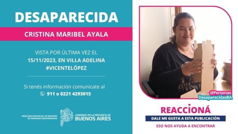 Cristina, de 42 años, fue vista por última vez el miércoles 15 de noviembre, en la zona del Hogar Kaupé, en #VillaAdelina, partido de #VicenteLópez.