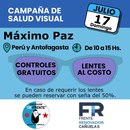La Organización de Frente, liderada por la dirigente Marta Ferraro organiza para el próximo domingo 17 de julio una Campaña de Salud Visual en Máximo Paz.