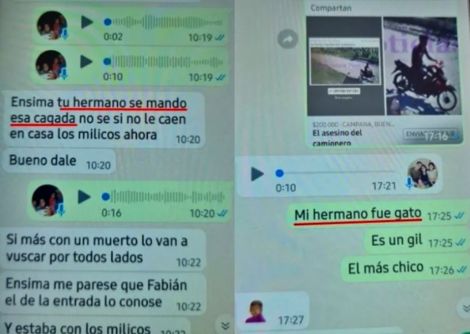En los aparatos peritados, surgieron mensajes de Whatsapp en un chat entre familiares. «Mi hermano fue, gato. Es un gil. El más chico»… “Encima tu hermano se mandó esa cagada, no sé si no le caen en casa los milicos ahora», fueron algunos de los diálogos que brindó elementos suficientes a la Fiscalía, y de utilidad para la investigación que lleva adelante la Dra. Ana Laura Brizuela, titular de la UFI N° 2.