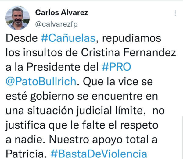 El comunicado publicado por el dirigente Carlos Álvarez, con relación a los dichos de la vice presidente Cristina Fernández, repudia su agresión dirigida a la persona de la presidente del PRO Nacional Patricia Bullrich: