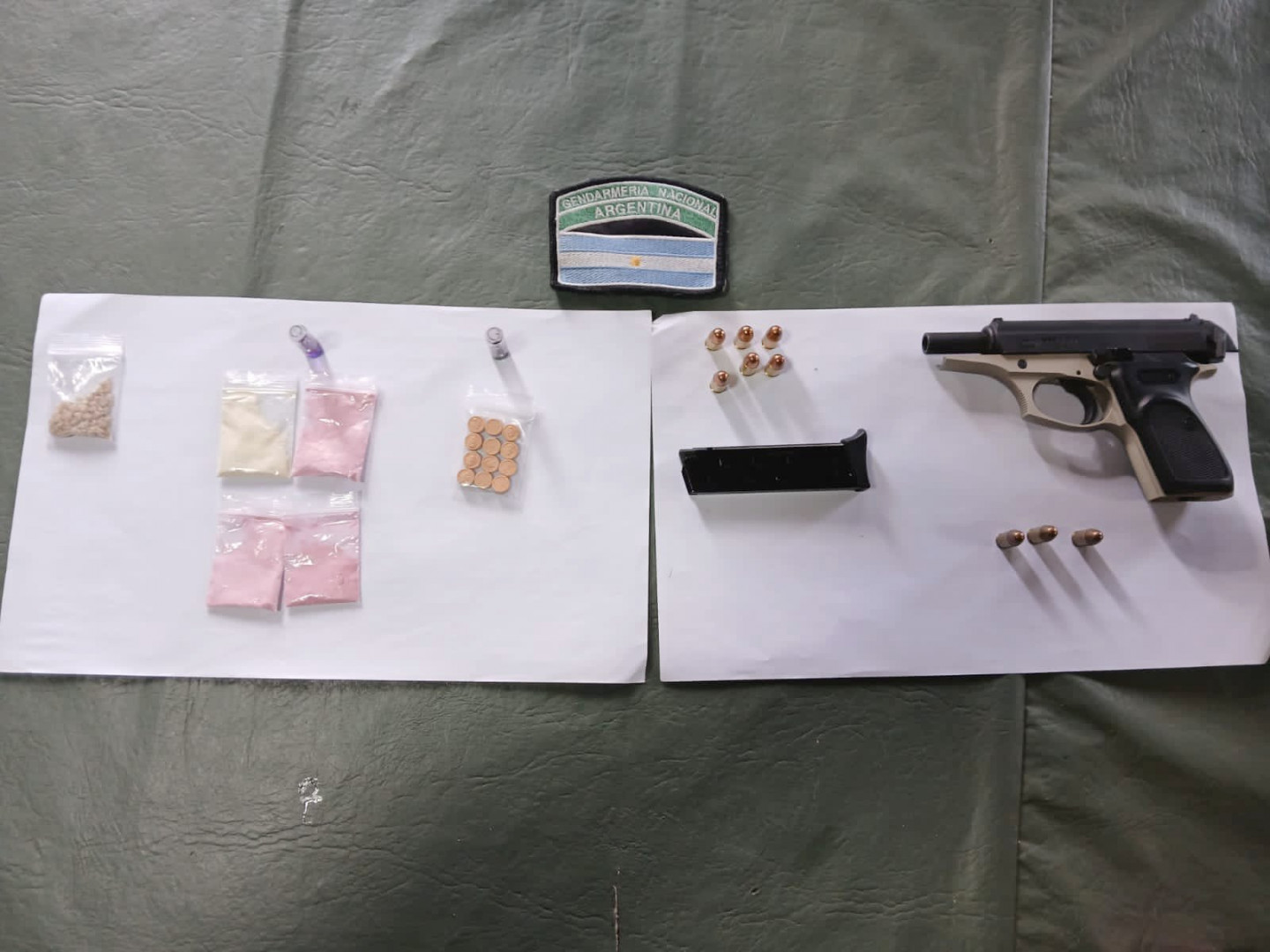 Seguidamente, los gendarmes al notar la existencia de una caja de cartón escondida debajo del habitáculo del apoya brazos, les solicitaron a los ciudadanos que realizarán la apertura. Al abrirla, los uniformados constataron la existencia de una pistola calibre 380 mm y envoltorios que contenían sustancias de diferentes texturas, colores y densidades.