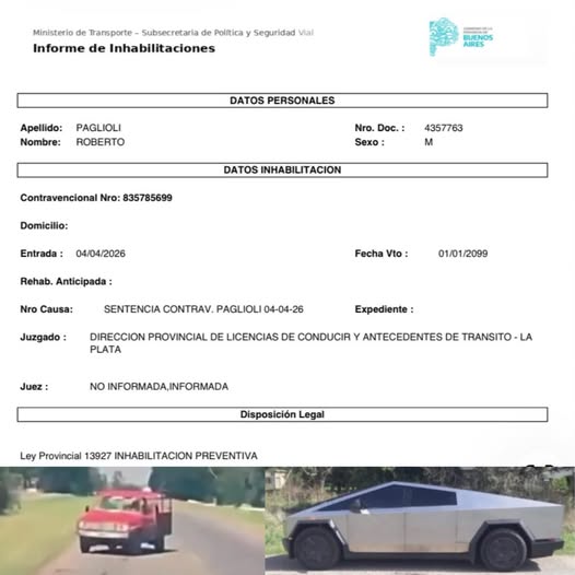 Roberto Paglioli, el conductor de Cañuelas que provocó el siniestro vial en Cañuelas al circular en sentido contrario por la Ruta 3, ha sido inhabilitado para conducir. Su maniobra imprudente afectó a Barby Franco y su hija, tras lo cual huyó de la escena. El hombre sería empresario dedicado a la producción de pretensados de hormigón y fibrocemento para la construcción. Se cruzó imprudentemente frente al Tesla de la esposa del mediático abogado Fernando Burlando, la modelo Barby Franco y en el que viajaban también su hija Sara de 3 años y una niñera.