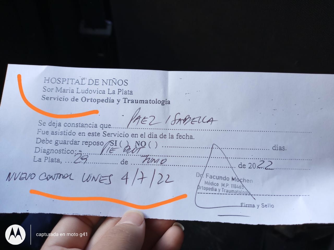 «La iban a operar el 16, le iban hacer su segunda cirugía (la misma q le hicieron a los 8 meses) pero tenía catarro y el anestesista no se arriesgaba a operarla así, se le sumó que el yeso había lastimado sus piernas (el yeso se cambia una vez a la semana o cada 15 días. Por lo general se ponen 4 yesos ó 5 ó 6 lo que lleve y se hace el corte de tendones » (tenotomía) esa es la cirugía que le hacen» y luego sale de quirófano con yesos , arranca el tratamiento de férulas y las férulas se usan 23 hs al día».
