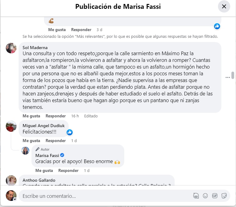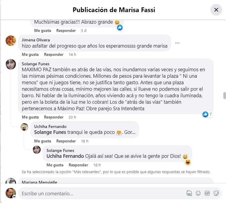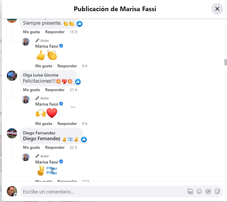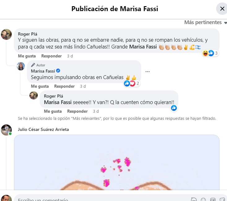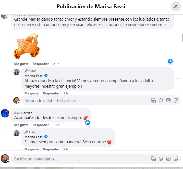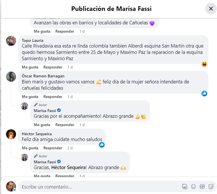 Pero, siempre hay un pero, Marisa, o el que maneja sus redes, no reacciona ni devuelve comentarios crítico, ni siquiera tibiamente descontentos. Da mucha pena observar sus publicaciones e invitamos a todos a que se detengan por un momento a confirmar lo que estamos diciendo. Por las dudas, publicamos algunas imágenes con comentarios «derretidos de ternura y amor» con la devolución de Marisa Fassi y otros con comentarios respetuosos y para nada agresivos ignorados por la Jefa Comunal.