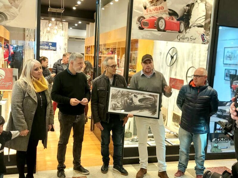 Junto con las fotografías que ilustran esta nota, Leonel publicó en sus redes: «Gracias Charly Pernbaum por la invitación a esta muestra tan maravillosa sobre Juan Manuel Fangio. Imperdible. También un agradecimiento a Pauru y a Rafael Varela Art por las obras que me obsequiaron.»