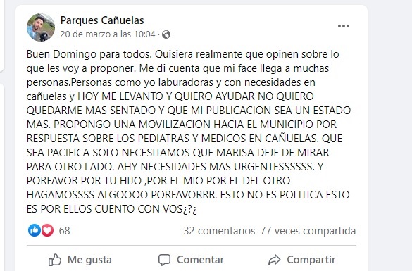 “PROPONGO UNA MOVILIZACION HACIA EL MUNICIPIO POR RESPUESTA SOBRE LOS PEDIATRAS Y MEDICOS EN CAÑUELAS. QUE SEA PACIFICA SOLO NECESITAMOS QUE MARISA DEJE DE MIRAR PARA OTRO LADO. AHY NECESIDADES MAS URGENTESSSSSS. Y PORFAVOR POR TU HIJO ,POR EL MIO POR EL DEL OTRO HAGAMOSSSS ALGOOOO PORFAVORRR. ESTO NO ES POLITICA ESTO ES POR ELLOS CUENTO CON VOS¿?”. Esta era su propuesta. La que finalmente con escasa participación de gente y ningún funcionario o dirigente se llevó a cabo ayer por la tarde en la esquina de Libertad y Del Carmen.