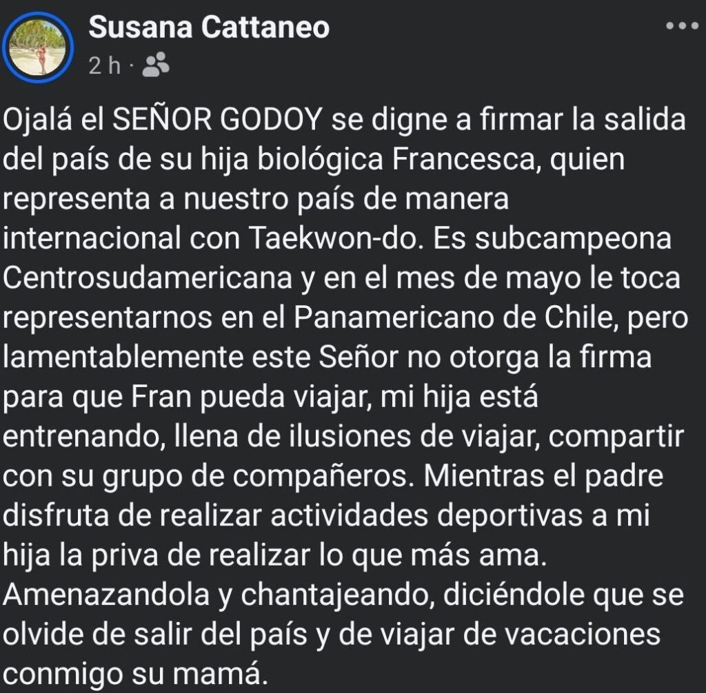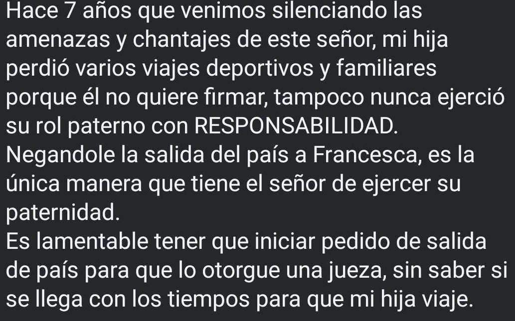 Francesca, con su valija llena de ilusiones, viene entrenando hace tiempo para este próximo desafío. Pero hoy publicó en sus redes las dificultades que afronta debido a que el papá de la niña, de quien ella está separada, no firmaría la autorización para que su hija viaje fuera del país. En su posteo Susana, que además hace público otras diferencias con el hombre, detalla que «él disfruta de practicar actividades deportivas a mi hija la priva de realizar lo que más ama.»