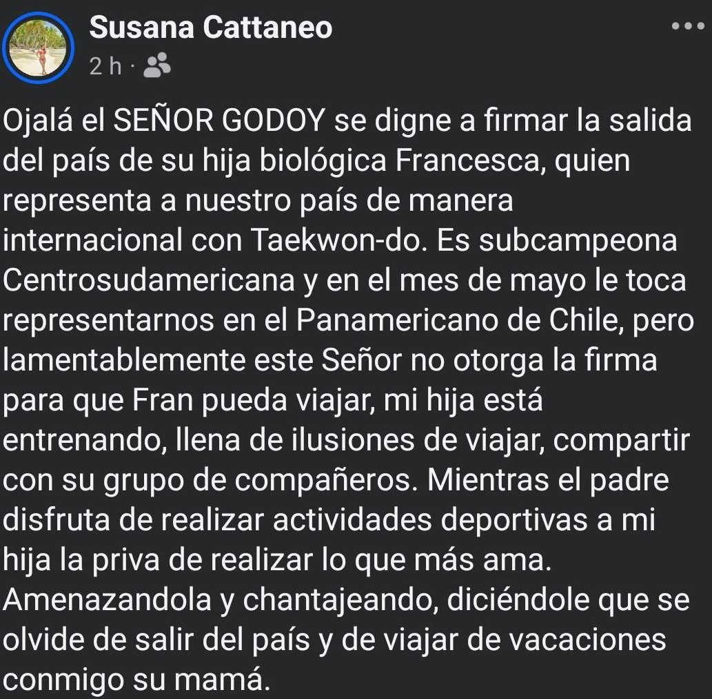 Francesca Godoy tiene 9 años y es ni más ni menos que Sub Campeona Centro Sudamericana de Taekwon do representando a la República Argentina. Practica ese deporte desde sus dos años y en pocos días, los primeros de mayo, debe participar en el Torneo Panamericano de la especialidad en Santiago de Chile. Francesca es hija de Susana Cattaneo, reconocida deportista, docente y vecina de Cañuelas quien publicó el pedido para que el papá la autorice a salir del país ya que se estaría negando a hacerlo, situación que sería repetitiva. Tras la publicación una gran cantidad de gente se solidarizó con Susana apoyándola en su pedido