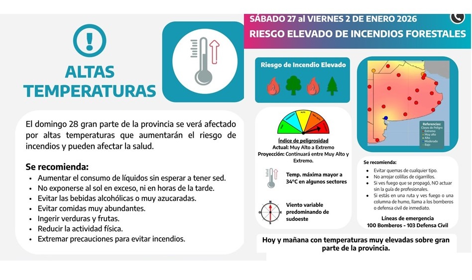 En cuanto a riesgos de incendios el nivel se mantendrá desde este sábado y por lo menos hasta el viernes 2 como “muy alto a elevado” con temperaturas que en algunas zonas superarán los 34° y vientos variables predominantes del sudoeste. En cuanto a esto las recomendaciones son: