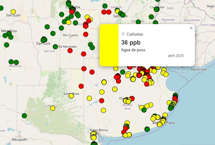En la zona de Cañuelas, y según se desprende del mapa del Instituto el agua presenta más de 36 ppb (partes por billón) lo que configura un serio riesgo para la salud humana. Toda la región, incluidos los vecinos distritos de Lobos, Monte, Roque Pérez, San Vicente y Navarro presentan la misma irregularidad.