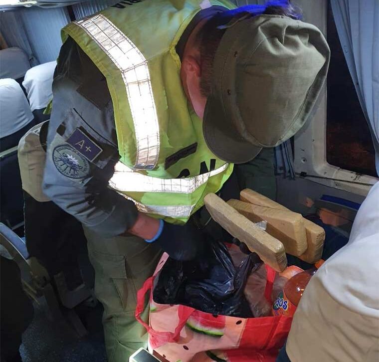 En ese contexto fue detenido en determinado momento un micro que se dirigía a la ciudad de Bahía Blanca. Personal de la fuerza ascendieron al coche procediendo a realizar un minucioso control de los equipajes de los pasajeros. Uno de ellos, un adulto de más de 50 años, llevaba en su cartera un curioso envoltorio que llamó la atención de las autoridades.
